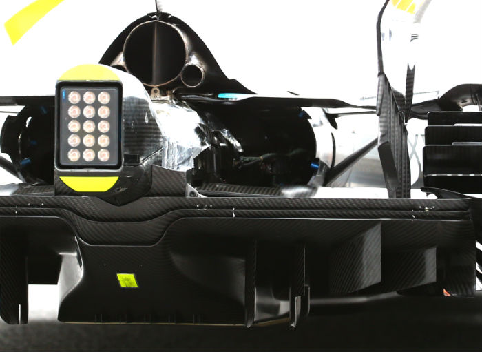 A look at the rear of the car was possible at the Silverstone launch, the larger diffuser is clear to see as is the lower and wider rear wing. The main wing support appears to pass through the exhaust tailpipe, something seen on a number of cars in recent years.