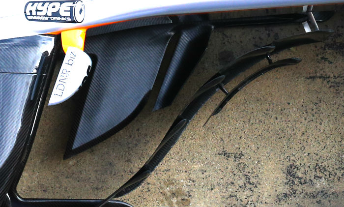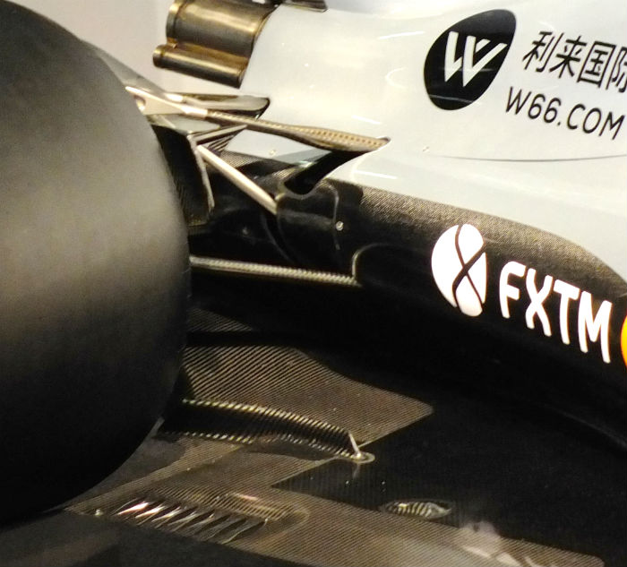 As with most recent F1 cars the VJM10 features an aerodynamic element around the leading edge of the sidepod, but unlike some it does not reach to the floor of the car.