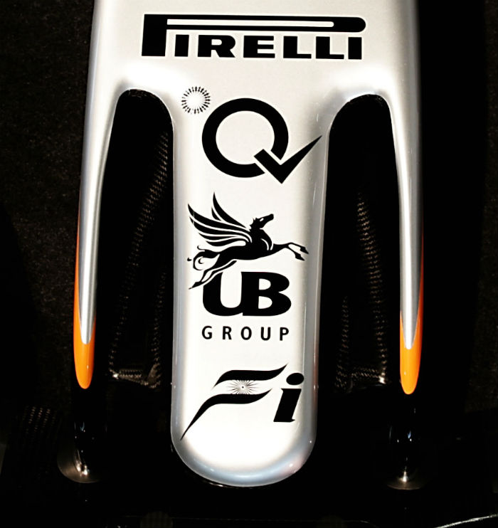 The launch specification front wing looks highly complex already but engineers at Force India have indicated that this will be the least complex design seen on the car in 2017 as an aerodynamic development arms race has broken out between the teams. As a result of the new regulations the wing has a rearward sweep and is wider than that used in 2016.