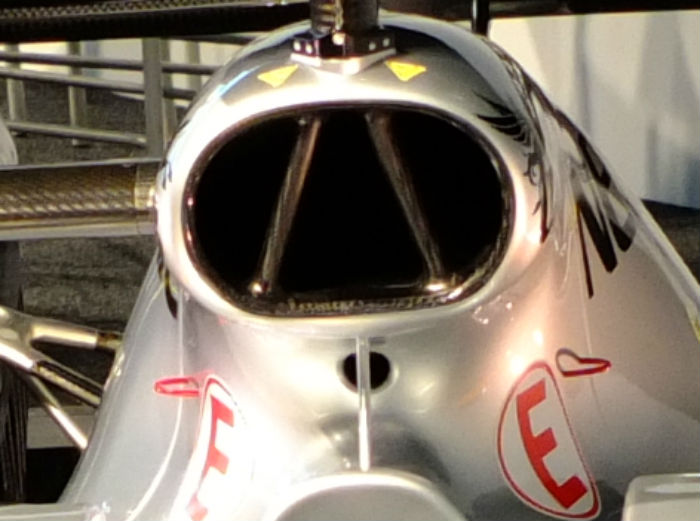 The duct is segmented into three parts the outer two segments feed air to the ERS cooler, while the central segment feeds combustion air to the Mercedes V6 engine. Another smaller cooling aperture is mounted below the main duct.