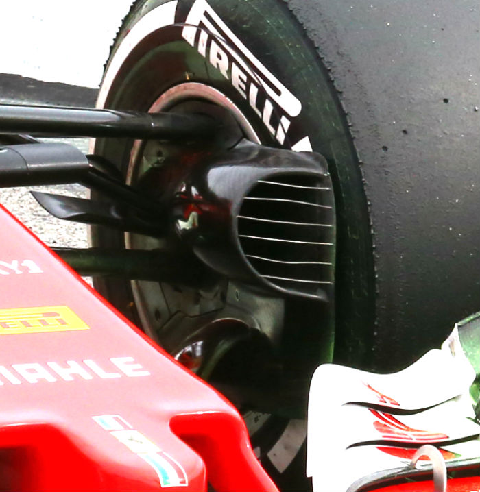 A look at the Haas front brake duct, it is very similar in overall design to that of the Ferrari SF70H (below) which uses identical uprights and suspension. The Haas brake duct however lacks the wires which run across the front of the Ferrari ducts.