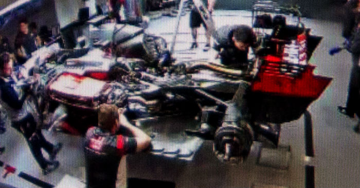 The overall layout of the car appears fairly similar to the 2016 model (below) the cooler arrangement appears to be exactly the same (at least in terms of concept) with one cooler mounted almost horizontally, with another cooler below it in a kind V shape. Looking at the installation of the 2017 Ferrari power unit it appears fairly similar to that of 2016, the turbine (and perhaps the compressor) is again mounted in the bell housing, with the exhaust entering the composite structure via holes in the side, the tailpipe exits via a hole in the top (as it did in 2016).