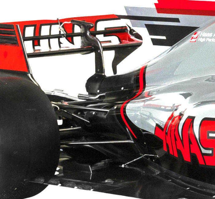 Haas fitted a aerodynamic component to its engine cover fin during the first test. Watching the Haas on track shows that the fin and the winglet move notably (wobbles) as the car rides the kerbs, something which cannot be especially helpful in terms of flow over it.