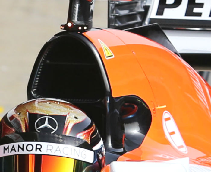 The roll hoop design largely carries over from the MRT05, featuring two forward remote supports and a roughly triangular air duct. Manor decided again to split the duct into two segments, the upper most part feeding a heat exchanger mounted above the transmission and the lower part feeding combustion air to the Mercedes V6 engine. Compare the 2017 design (above) with the 2016 design (below).