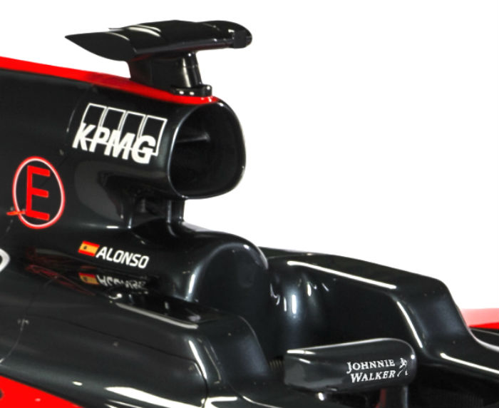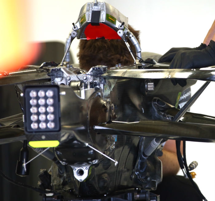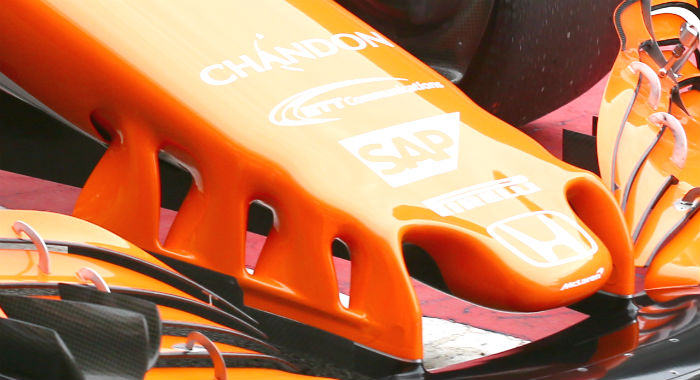 The nose on the MCL32 is vented as was the case with the MP4-31, but this time the exit on the top of the nose is not split by an antenna. Note the shape of the parts around the bargeboards.