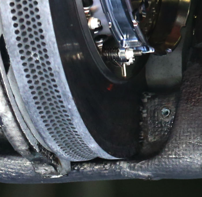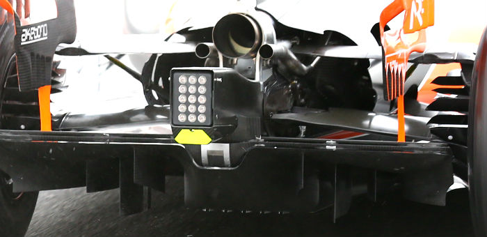 McLaren ran with this semi cylindrical part at the rear of its floor in testing, it is not clear if this is to check the tyres clearance to the floor or if it is an aerodynamic component.
