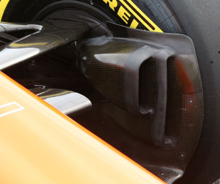 As with all 2017 F1 cars the area behind the front wheel and ahead of the sidepod is extremely complex on the McLaren, with a great number of details on the barge board. Note how it connects to the side of the monocoque at its leading edge.