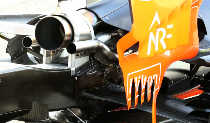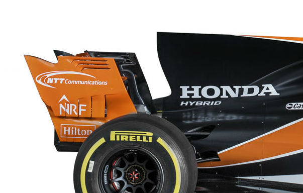 A look at the rear of the MCL32 shows the rear wing mounting, and McLaren seems to have dropped the idea of passing the support through the tailpipe used on the MP4-31, in favour of a more conventional mounting. The pull rod rear suspension layout is visible also.