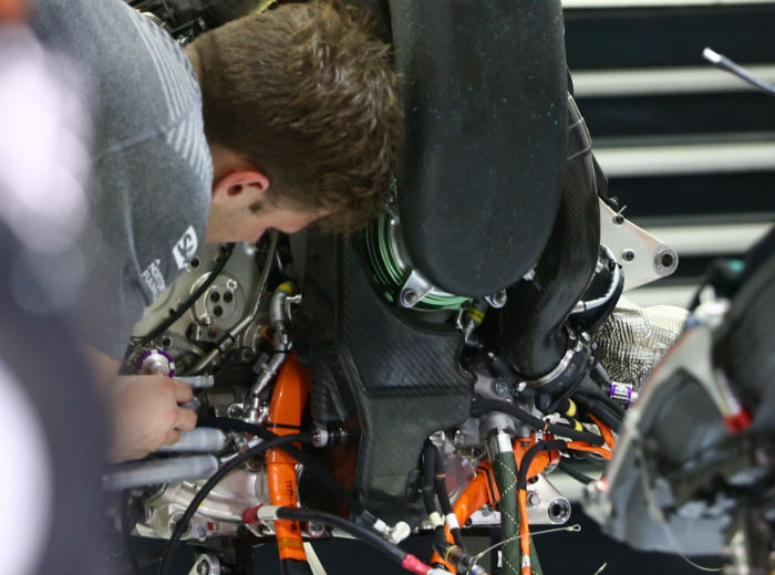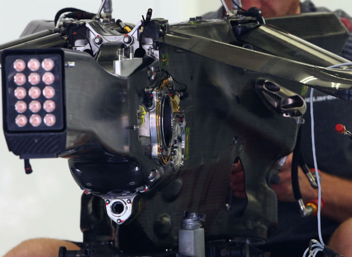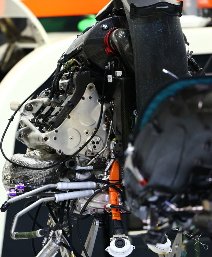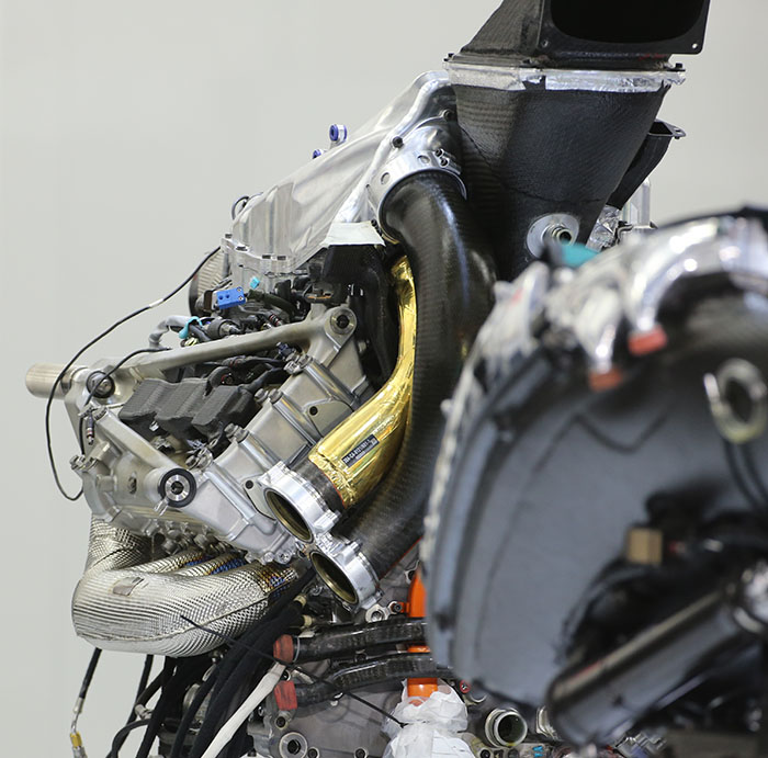 A look at the front end of the RA617H, the turbo-charger retains the split layout seen on the RA615H and RA616H. It is not clear if the compressor has been moved forwards. Note the orange high voltage electrical cables which reveal that the MGU-H remains in the V of the engine while the MGU-K sits on the left side of the crankcase.