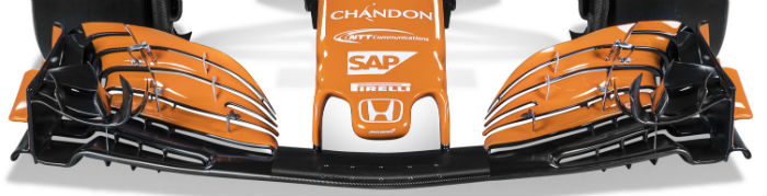 The front wing and nose concept of the MCL32 is fairly similar to that of the MP4-31 but adapted to the new regulations including the wider swept back front wing. Compare the new car (above) with the old (below).