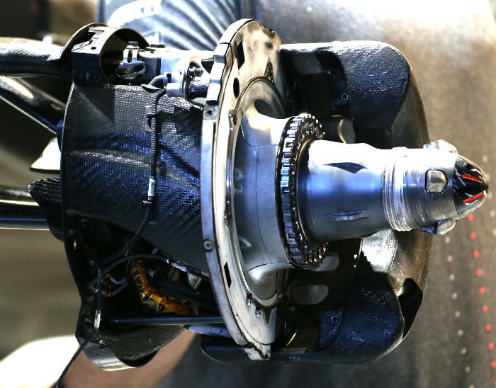 McLaren remains the only team in the F1 paddock to use Akebono brake calipers. Here we can see the rear brake setup with the caliper mounted at the base of the (removed) disc. It has a composite covering. Note the many aerodynamic elements on the inner face of the assembly.