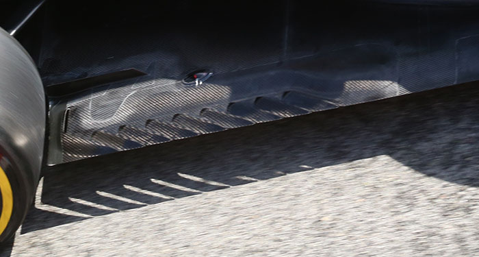 The rear floor is an area of development for Mercedes, the array of cut outs leads to a large cutout just ahead of the tyre, it is thought that these features are designed to reduce the impact for a vortex from the base of the rotating rear tyre on the performance of the diffuser.