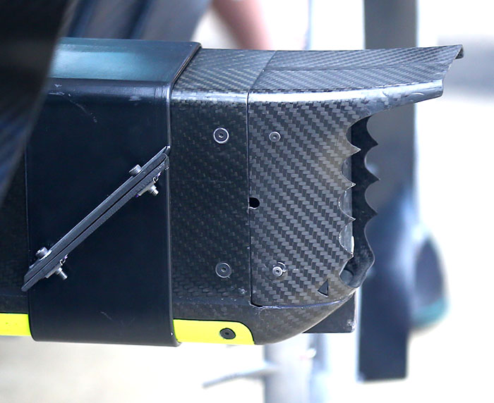 The trailing edge of the rear impact structure is fitted with a carbon fibre extension complete with a saw tooth edge.