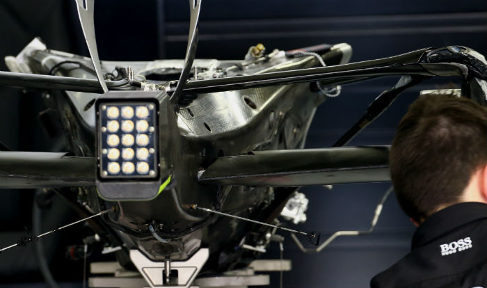 Another look at the Mercedes transmission used on the Force India which has a composite outer case and a metal inner section which can just be seen in a couple of points in his image. Note also the caliper position on the rear brake.