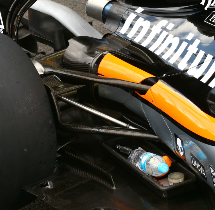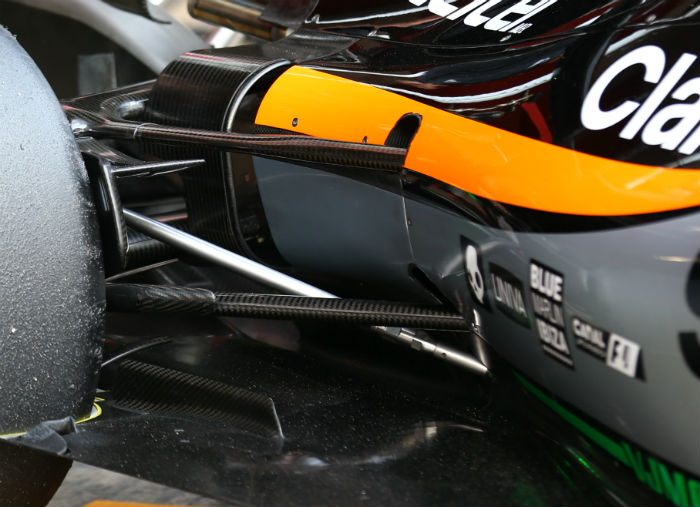 The VJM09 (above) has notably smaller and reshaped sidepod ducts compared to the VJM08 (below). This could suggest that the 2016 Mercedes power unit requires less cooling or that Force India is willing to be a little more aggressive in this area.