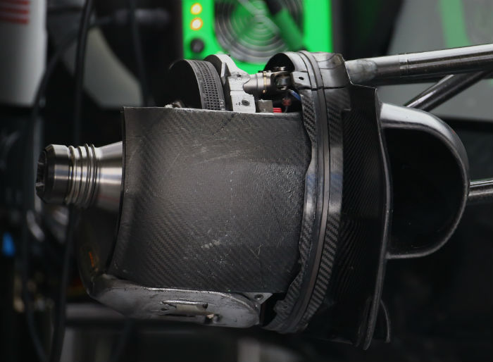 Here is a good look at the rear of the car, note the twin wastegate exist either side of the tailpipe. The ‘monkey seat’ winglet has a gold thermal barrier (possibly Zircoflex Gold) applied to protect it from the exhaust heat. Not clear in this or any images seen yet is whether the rear wing support passes through the tailpipe but it seems that it does. The rear wing endplate features a slot on the leading edge and a number of strakes, at the base there is the now standard feathered base.