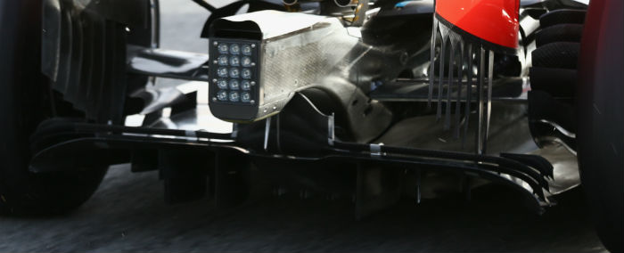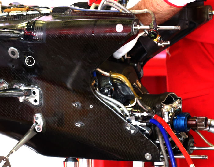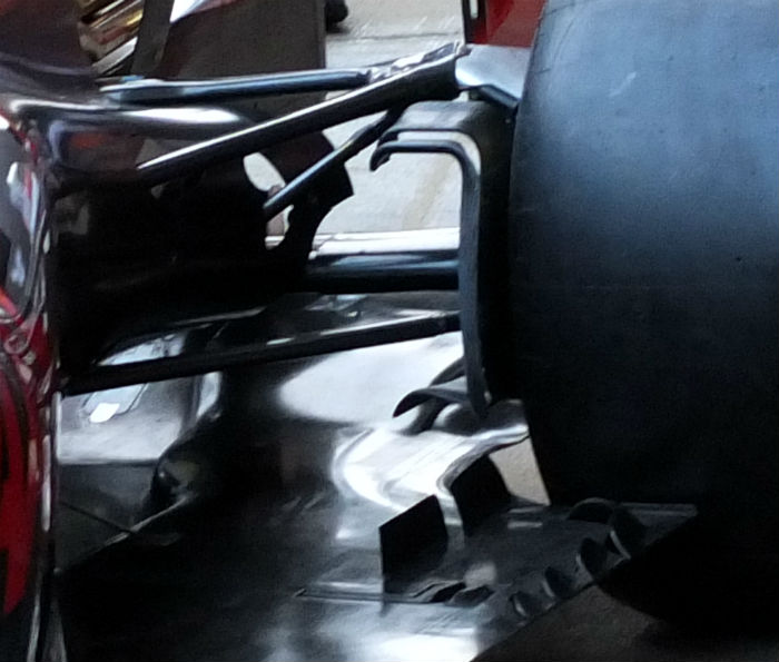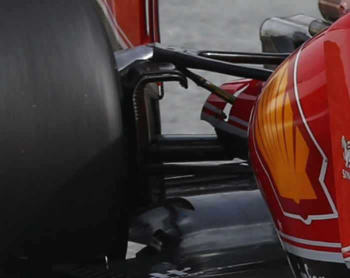 The Ferrari, above has a very similar treatment in terms of the turning vane around the outer edge of the sidepod and the small bump caused by the protruded side impact structure.