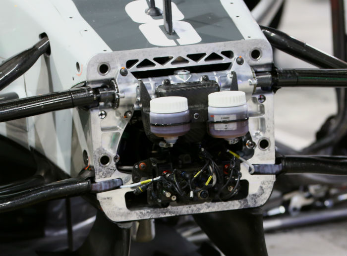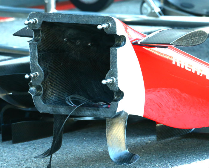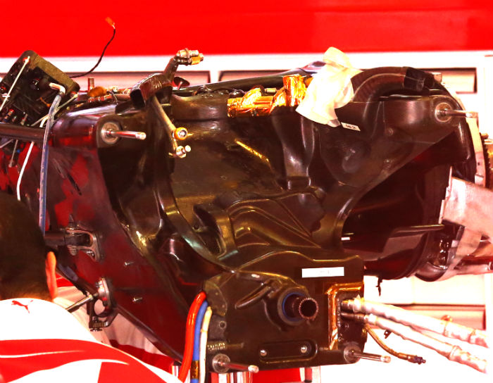 Under the skin of the sidepod the usual side impact structure is visible as is the array of electrical control boxes and some hydraulic actuators.