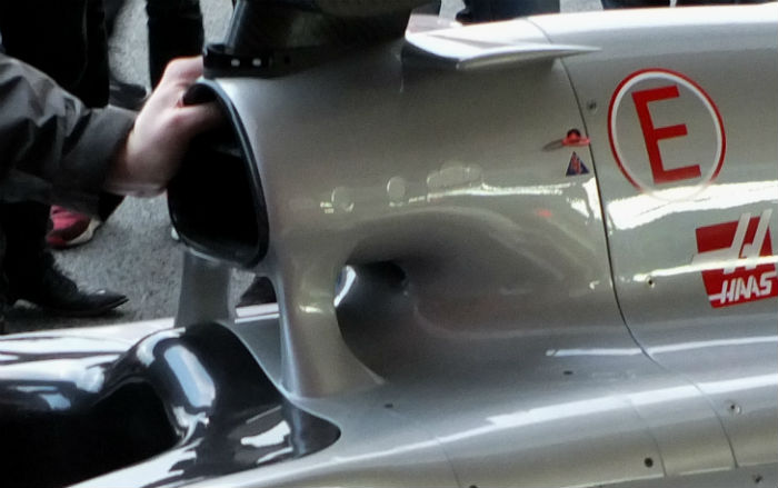 Below is another look at the roll hoop and airbox design on the Haas, the under hoop cooling duct is just visible.