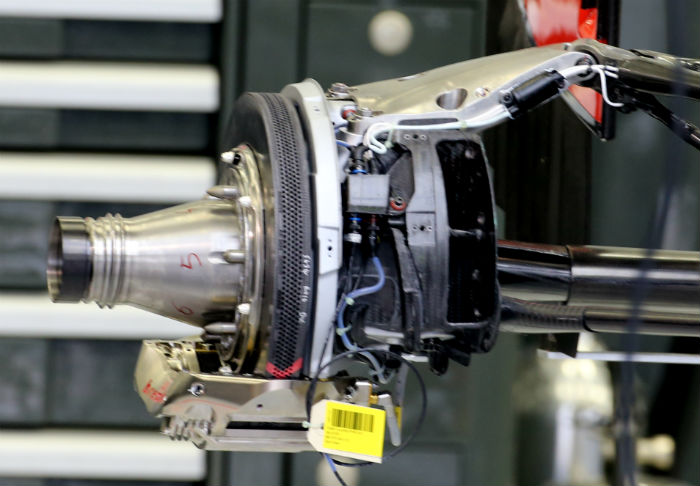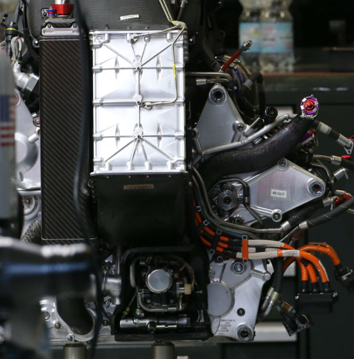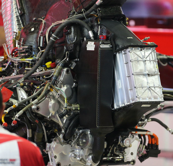 A look at the front end of the Ferrari power unit reveals a charge air cooler at the front of the engine block. The oil tank is on the right hand side of the front of the block.