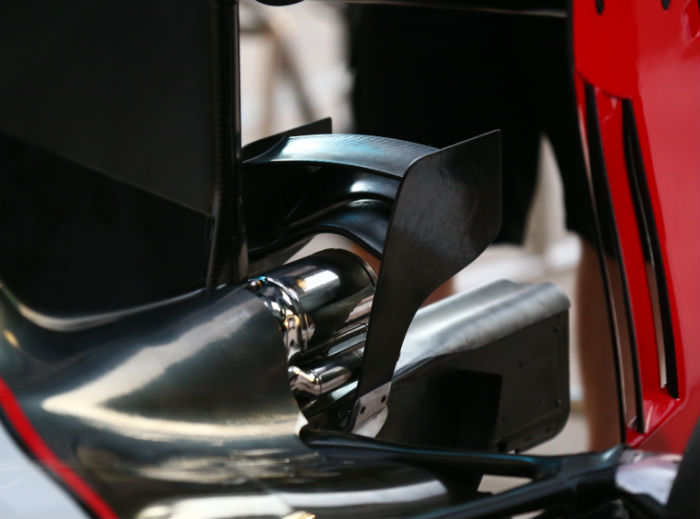 The sidepod duct on the VF-16 is fairly conventional (the cooler is just visible in this image), a small slot under the main duct likely cools some electronic components mounted under the bodywork in this area. A small bulge on the outer edge of the sidepod is visible, this is the out extremity of the mandatory side impact structure.