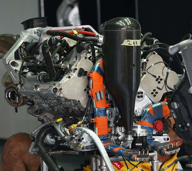 Here we can see the new ‘B’ specification V6 motor (or moteur if you feel a bit French), the exhaust has been removed, and the MGU-K made by Marelli is clear to see, the overall design
