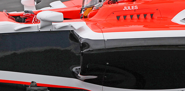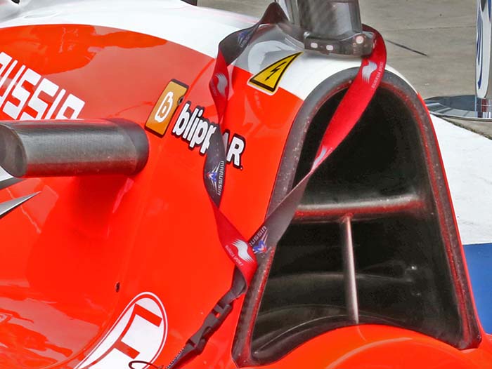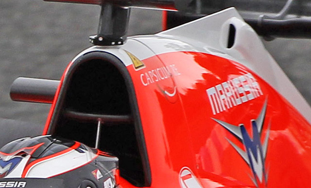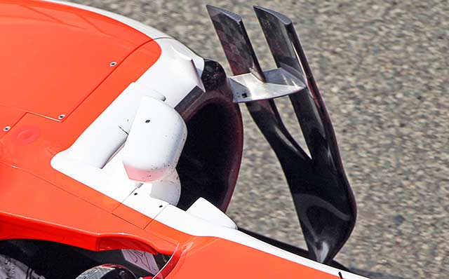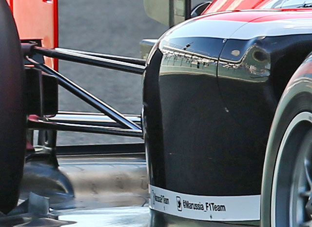The Marussia MR03 has very few aerodynamic details, but there are some around the cockpit including three turning vanes below the wing mirror. Note also the cooling louvers next to the drivers head protection.