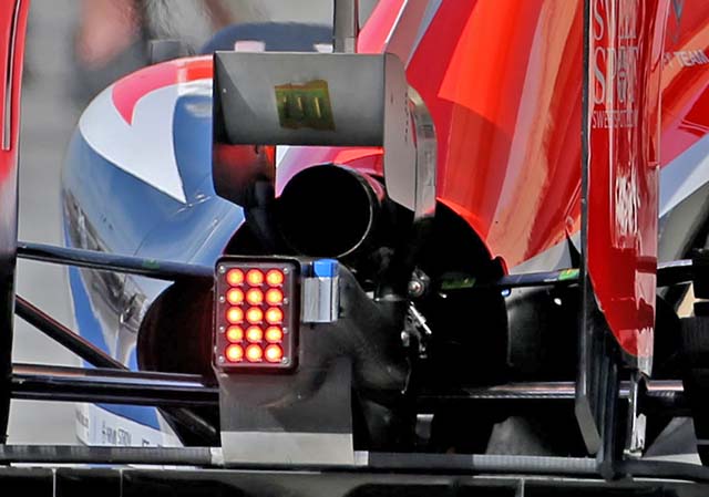 A few minor changes were made to the rear of the car including a new coating on the ‘y-lon’ wing support and the ‘monkey seat’ winglet. Seen here as a lighter coloured section. Note the temperature strips.