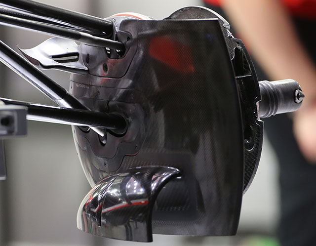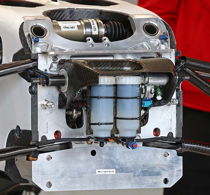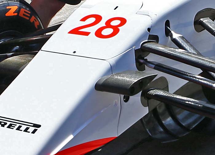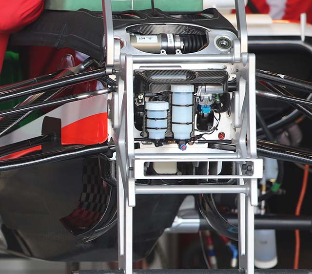 The exterior of the spacer plate can be seen here with by looking at the panel lines on the car. The forward front wishbone points remain as they were in 2014 but now there is a short extra section ahead of the nose.