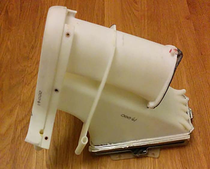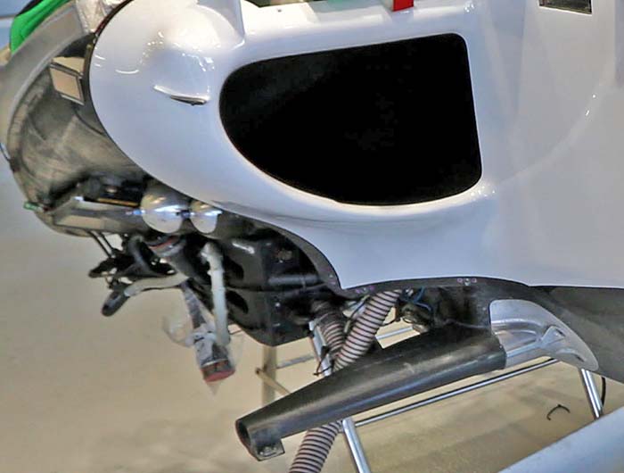 With the air from the roll hoop duct apparently entering via the two pipes coiled over the cooler. Â Looking from the back of the cooler assembly which was mounted at the front of the V6 engine (as can just be seen in some of the other images in this article – it fed air back into the plenum via a single pipe – seen here with what appears to be a piece of Samco sport hose.