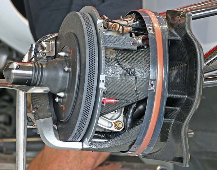 The outboard upper mounting is clear to see from this shot of the MR03’s rear upright. Note the brake caliper design, using a FEA optimised concept popularised by Alcon with OSCA and AP Racing with the Radi-Cal.