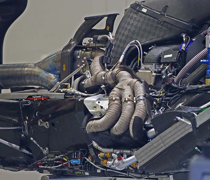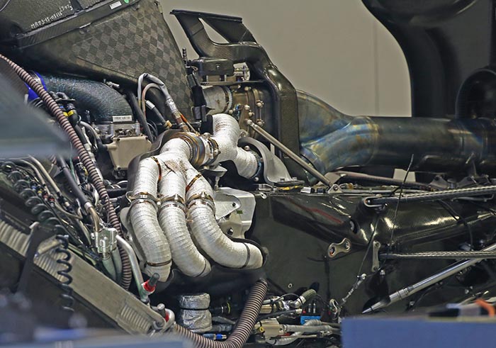 Later in the season the Ferrari V6 engine was upgraded to some extent, and exhaust wrap was added, the absence of which had confounded many engineers at rival engine manufacturers as they felt the lost heat would cost performance overall. Note the turbo cooling pipes fed from the engine cover mounted duct.