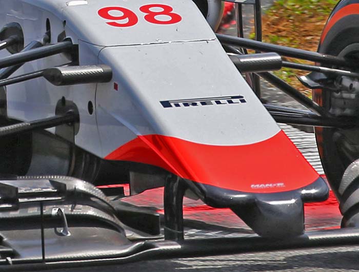 But on closer inspection it is revealed that while the nose structure, very similar to that seen on the Manor MNR1 design is new, the front of the chassis remains unchanged. Instead a small composite spacer plate has been added between the nose and the chassis. It is just visible below (we hope to get a better image of this soon)