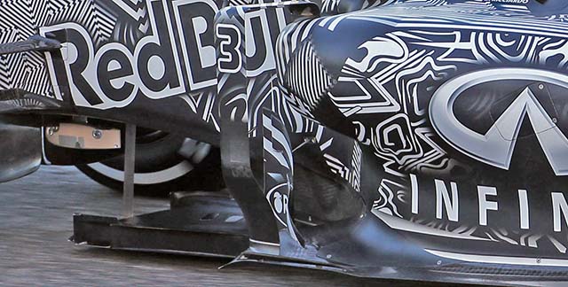 The front bulkhead of the RB11 is fairly large compared to some other 2015 cars. It still features a duct as was the case with the RB10. The entry ducts have been extended from the base of the nose to the side, as can be seen below.