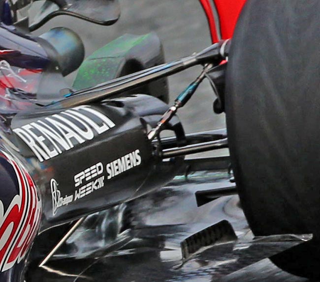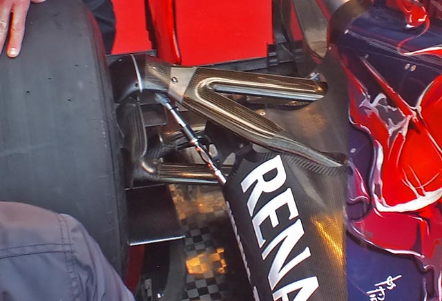 The Toro Rosso utilises many shared transmission and hydraulic components with Red Bull Racing as well as the general engine installation. But the bell housing and main case are unique to Toro Rosso and made in Italy. All new rear suspension mounts to that gear case details of which are not yet clear but Key hints that it is a major area of development.