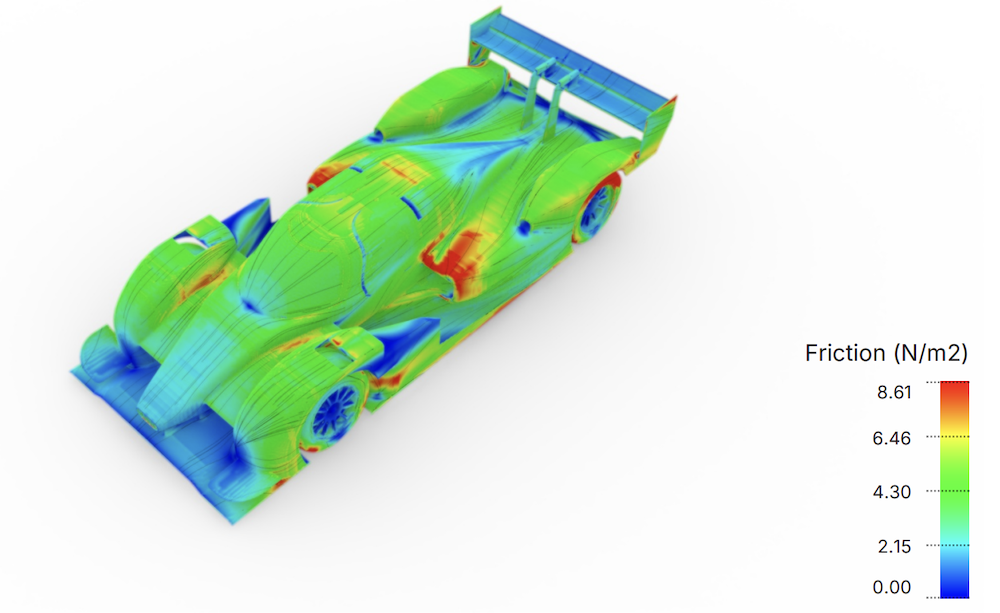 So, apart from a small reduction in friction drag, a low surface friction area is usually a bad sign, as it indicates the airflow has separated and is no longer attached to the surface, resulting in less sliding friction. Surface streamlines are also shown, which indicate the pattern followed by the air across the surface.